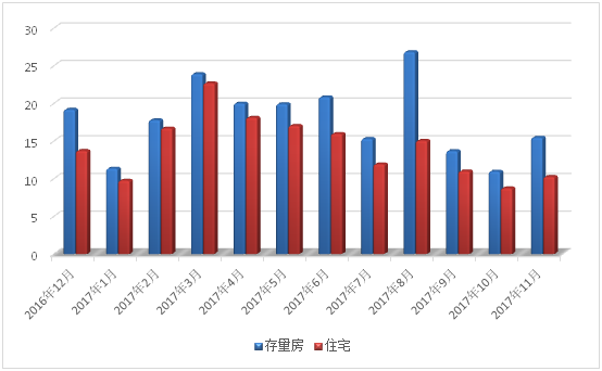 2016年12月—2017年11月二手房和住宅成交面积对比图